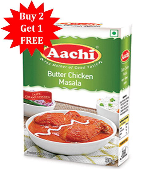 Heat 2 tbsp of oil in a pan and saute 1 finely chopped onion until golden brown and 2 tbsp of ginger garlic paste for a minute. Grind 3 fresh tomatoes and add it. Cook until the raw aroma goes off. Add 2tbsp of Aachi Butter Chicken Masala , 200g of fresh and clean boneless chicken pieces and stir fry until half cooked. Add 1 cup of milk and 2 tbsp of butter and cook for a minute. Salt can be added as per taste. Garnish with chopped fresh coriander leaves and serve hot Butter Chicken with Naan / Roti.